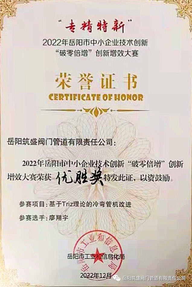 岳筑宣2022年12月6日訊:2022年12月5日我公司委派技術(shù)部廖翔宇工程師參加了2022年岳陽市“專精特新”中小企業(yè)技術(shù)創(chuàng)新“破零倍增”創(chuàng)新增效大賽基于Triz理論的冷彎管機(jī)改進(jìn)項(xiàng)目中榮獲優(yōu)勝獎!