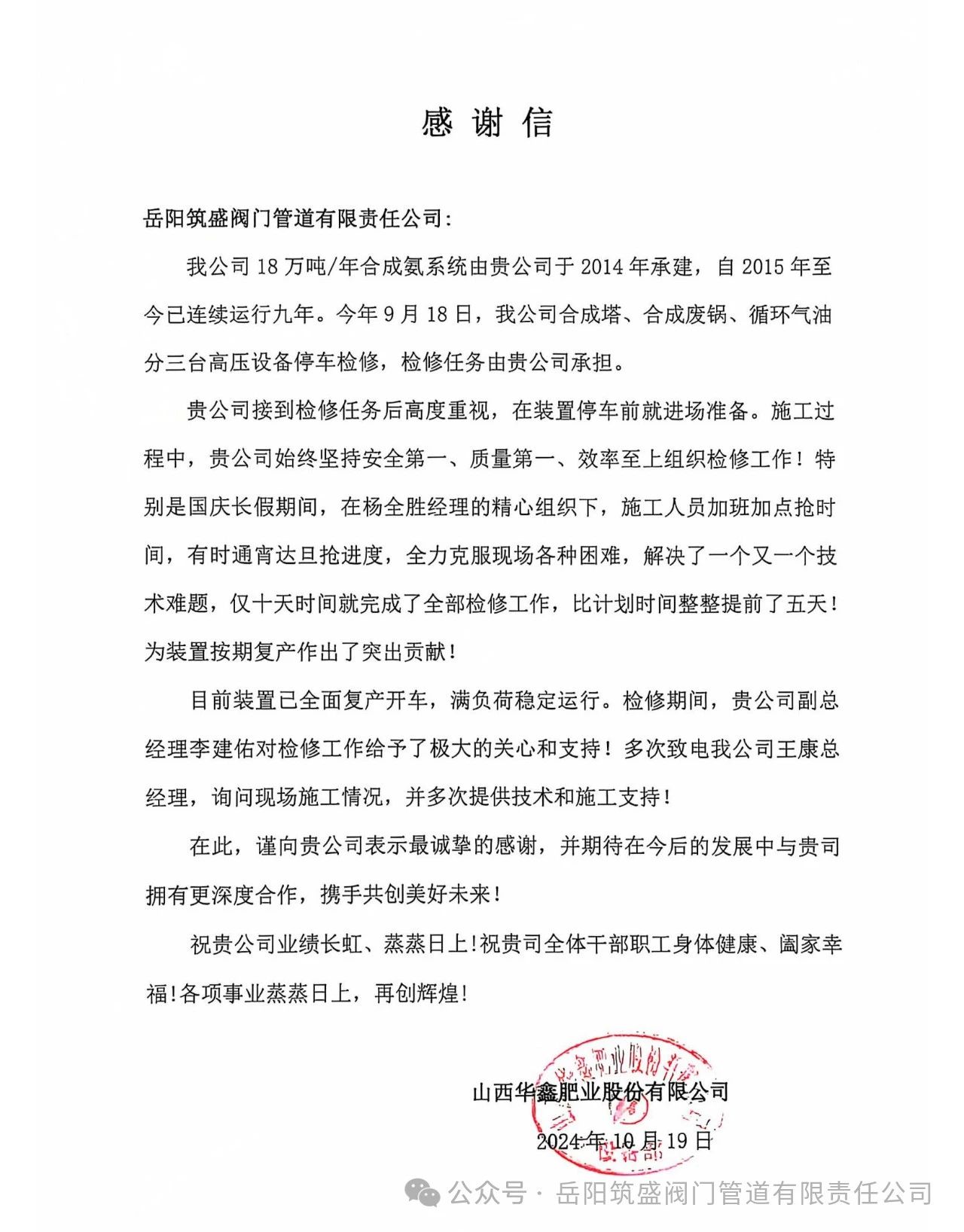 岳筑宣2024年10月21日訊:10月19日下午,由我公司承建運維的山西華鑫肥業(yè)有限公司發(fā)來感謝信。全文如下: